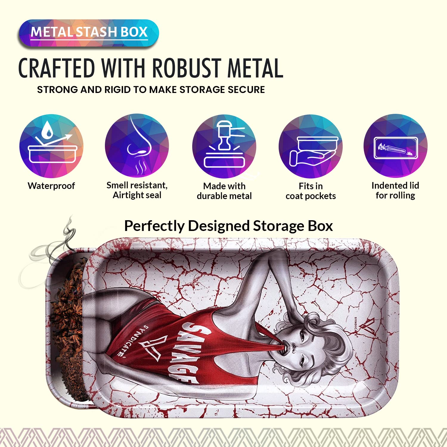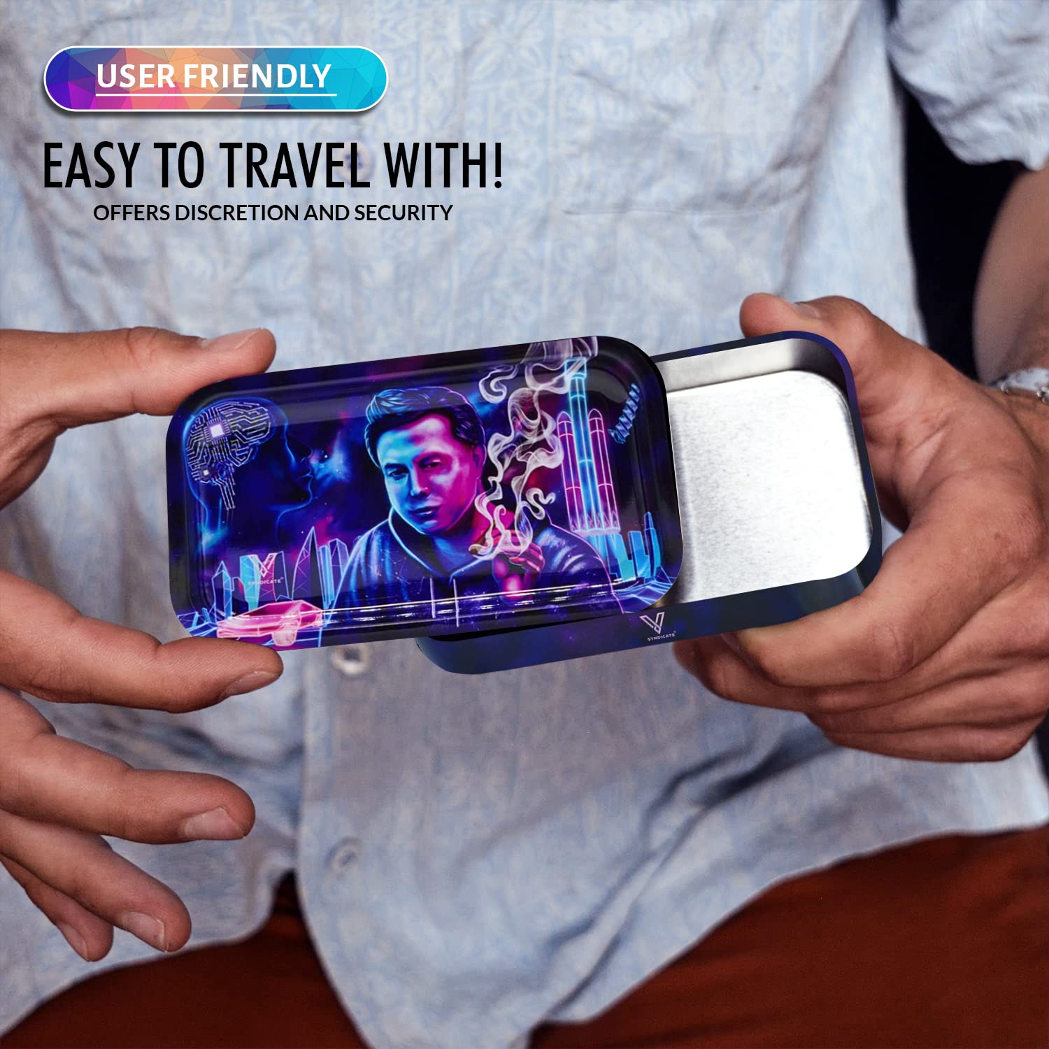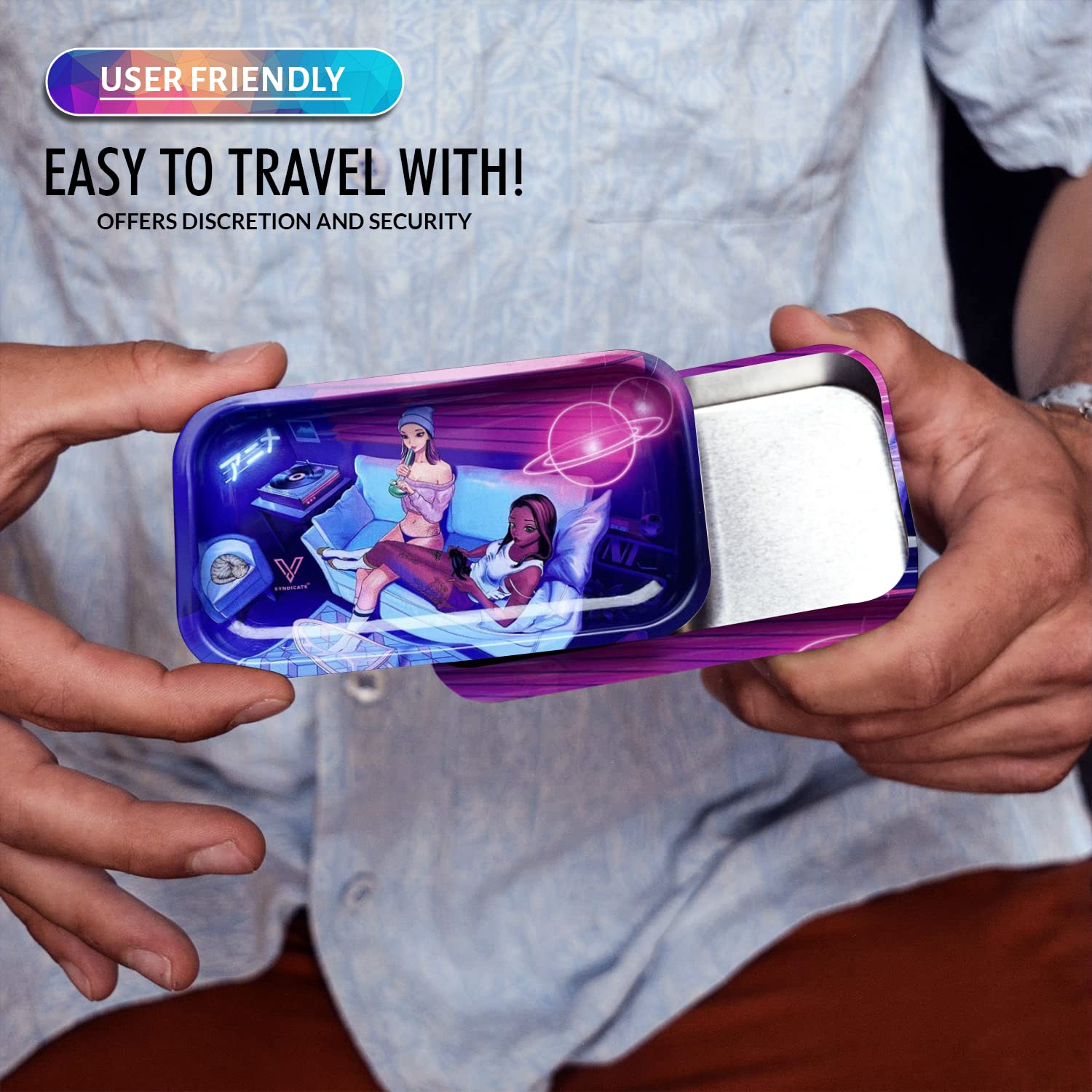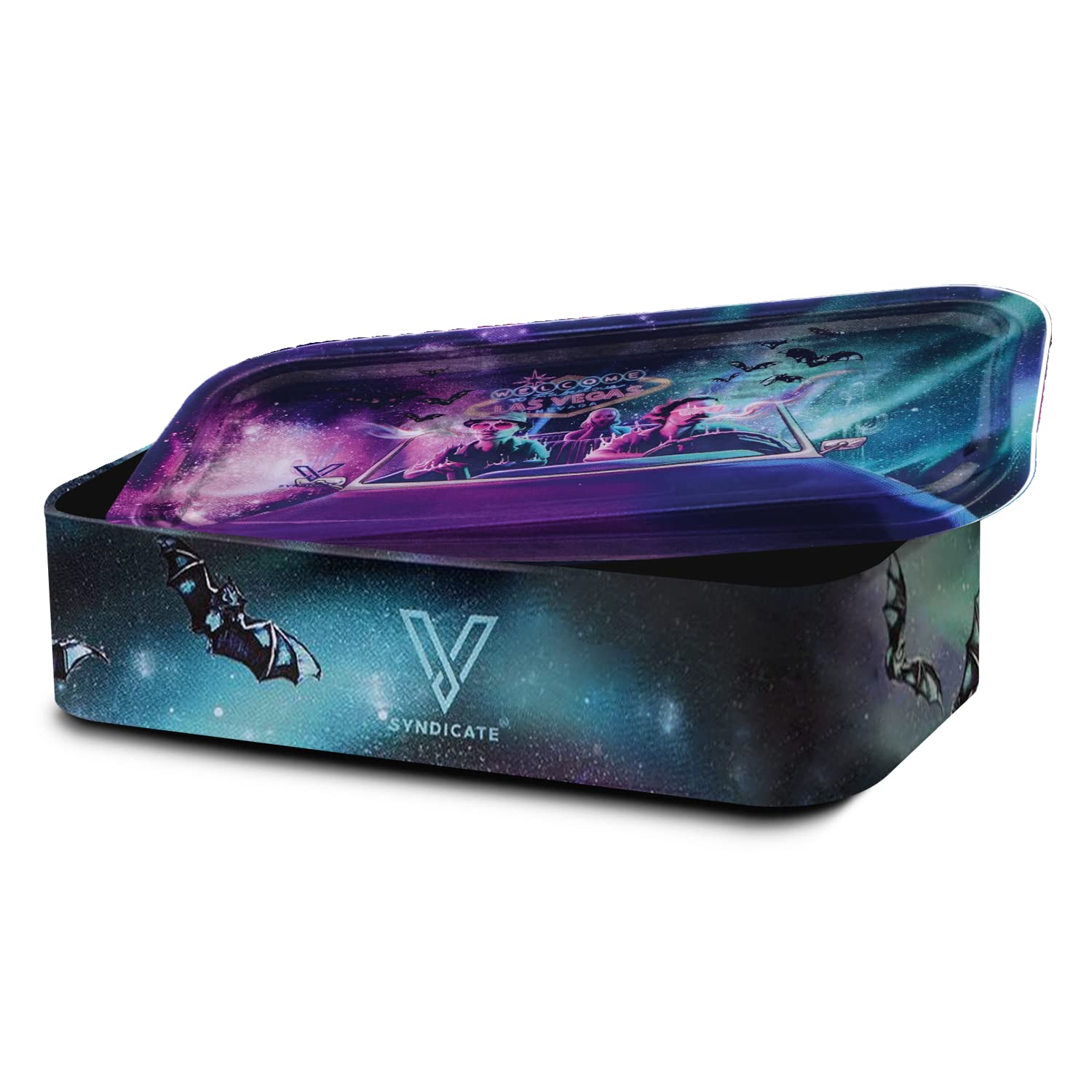 [Robust and Protected] The V Syndicate storage box is designed to provide robust and protected storage for your valuables. The premium metal construction and airtight seal ensure that your items are safe from moisture and other elements, ensuring their longevity for years to come. Don't settle for less, protect your valuables with the V Syndicate storage box. [Privacy and Freshness] Keep your treats fresh and hidden from prying eyes with the V Syndicate storage box. Equipped with an aroma-sealed airtight lid, this storage box guarantees to keep your treats fresh and hidden. Enjoy your treats in peace and privacy with our storage solution. [Personalized Style] Add a touch of personal style to your storage box with a unique 360 print of original artwork. Each piece is a one-of-a-kind creation that ensures that your storage box is not just a functional storage but also a stylish accessory. Stand out from the crowd with your unique storage solution. [Innovative 2-in-1 Design] Get the most out of your storage box with an innovative 2-in-1 lid design. Not only does it seal in freshness, but it doubles as a metal tray, making it the perfect companion for all your rolling needs.This travel-size box can even fit in a pocket. [Trusted Brand] Trust V Syndicate provides you with top-notch storage solutions that combine innovation, functionality, and quality. Our commitment to meeting customers' needs and providing the best quality products guarantees that your items will be safe and secure with our products. We are your go-to brand for storage solutions.