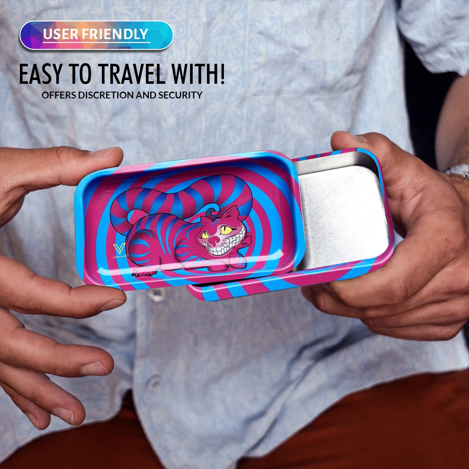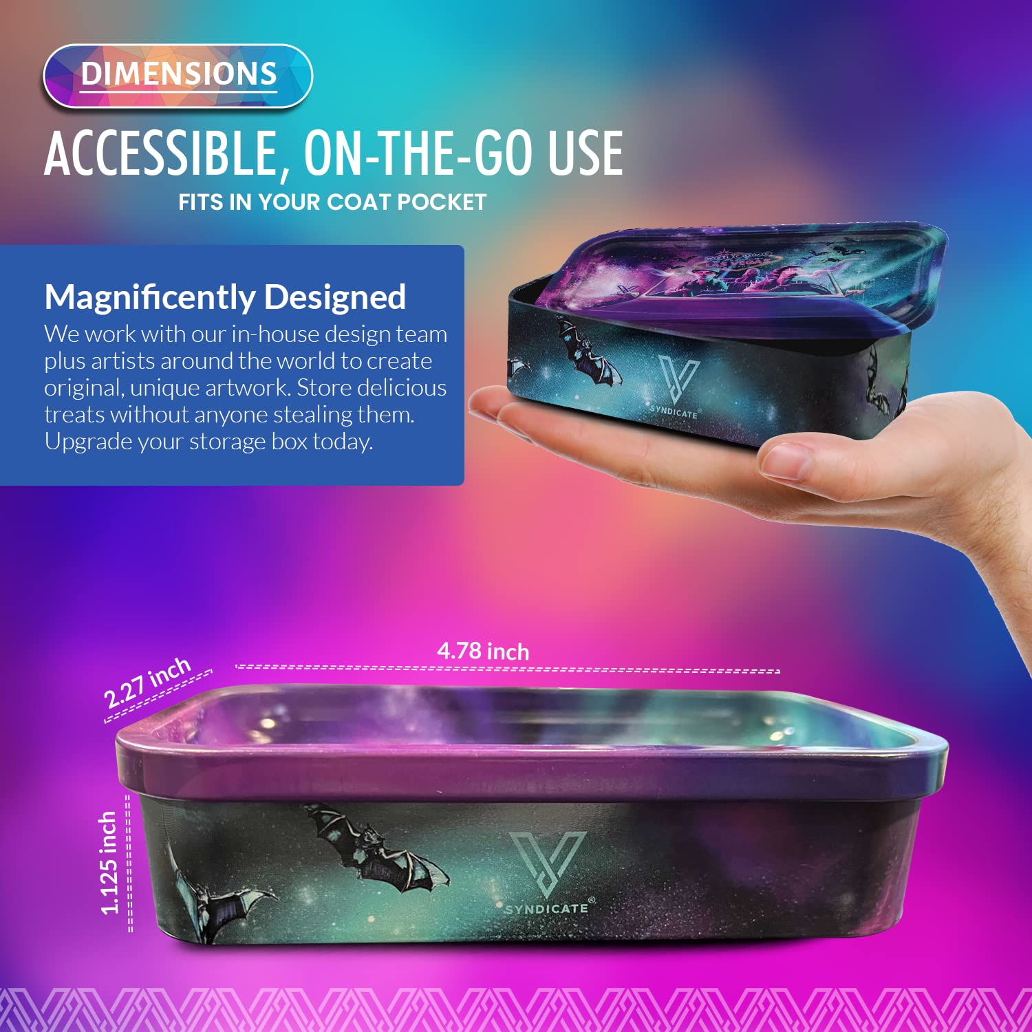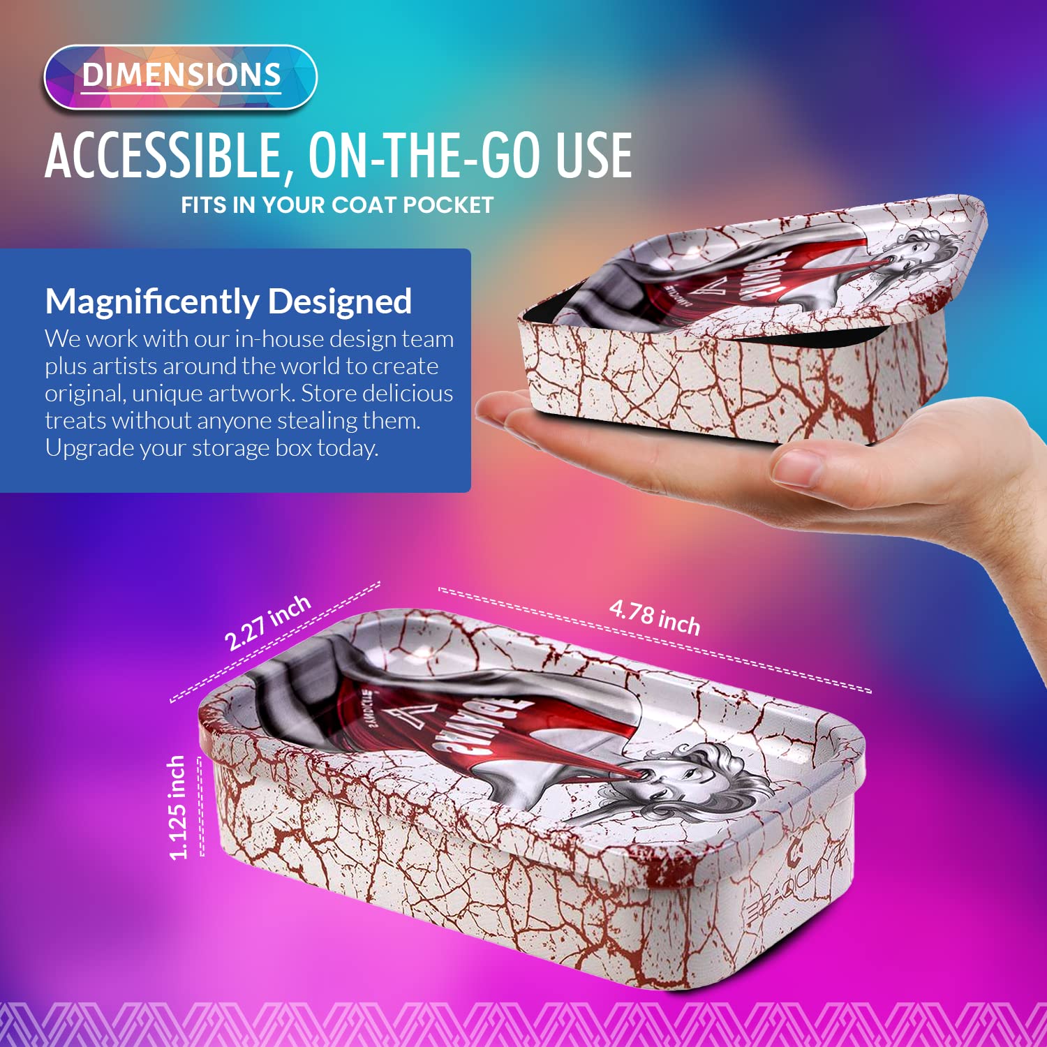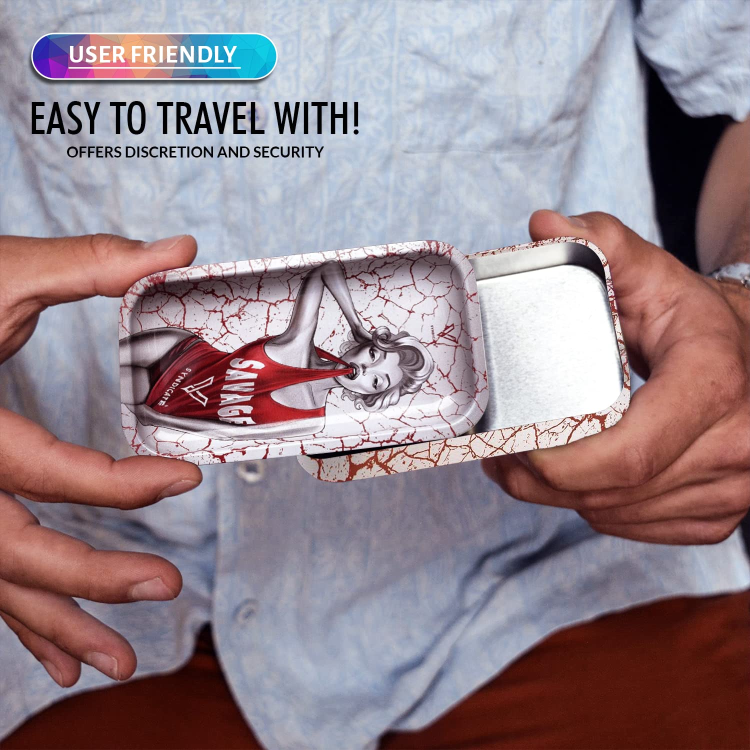 [Robust and Protected] The V Syndicate storage box is designed to provide robust and protected storage for your valuables. The premium metal construction and airtight seal ensure that your items are safe from moisture and other elements, ensuring their longevity for years to come. Don't settle for less, protect your valuables with the V Syndicate storage box. [Privacy and Freshness] Keep your treats fresh and hidden from prying eyes with the V Syndicate storage box. Equipped with an aroma-sealed airtight lid, this storage box guarantees to keep your treats fresh and hidden. Enjoy your treats in peace and privacy with our storage solution. [Personalized Style] Add a touch of personal style to your storage box with a unique 360 print of original artwork. Each piece is a one-of-a-kind creation that ensures that your storage box is not just a functional storage but also a stylish accessory. Stand out from the crowd with your unique storage solution. [Innovative 2-in-1 Design] Get the most out of your storage box with an innovative 2-in-1 lid design. Not only does it seal in freshness, but it doubles as a metal tray, making it the perfect companion for all your rolling needs.This travel-size box can even fit in a pocket. [Trusted Brand] Trust V Syndicate provides you with top-notch storage solutions that combine innovation, functionality, and quality. Our commitment to meeting customers' needs and providing the best quality products guarantees that your items will be safe and secure with our products. We are your go-to brand for storage solutions.