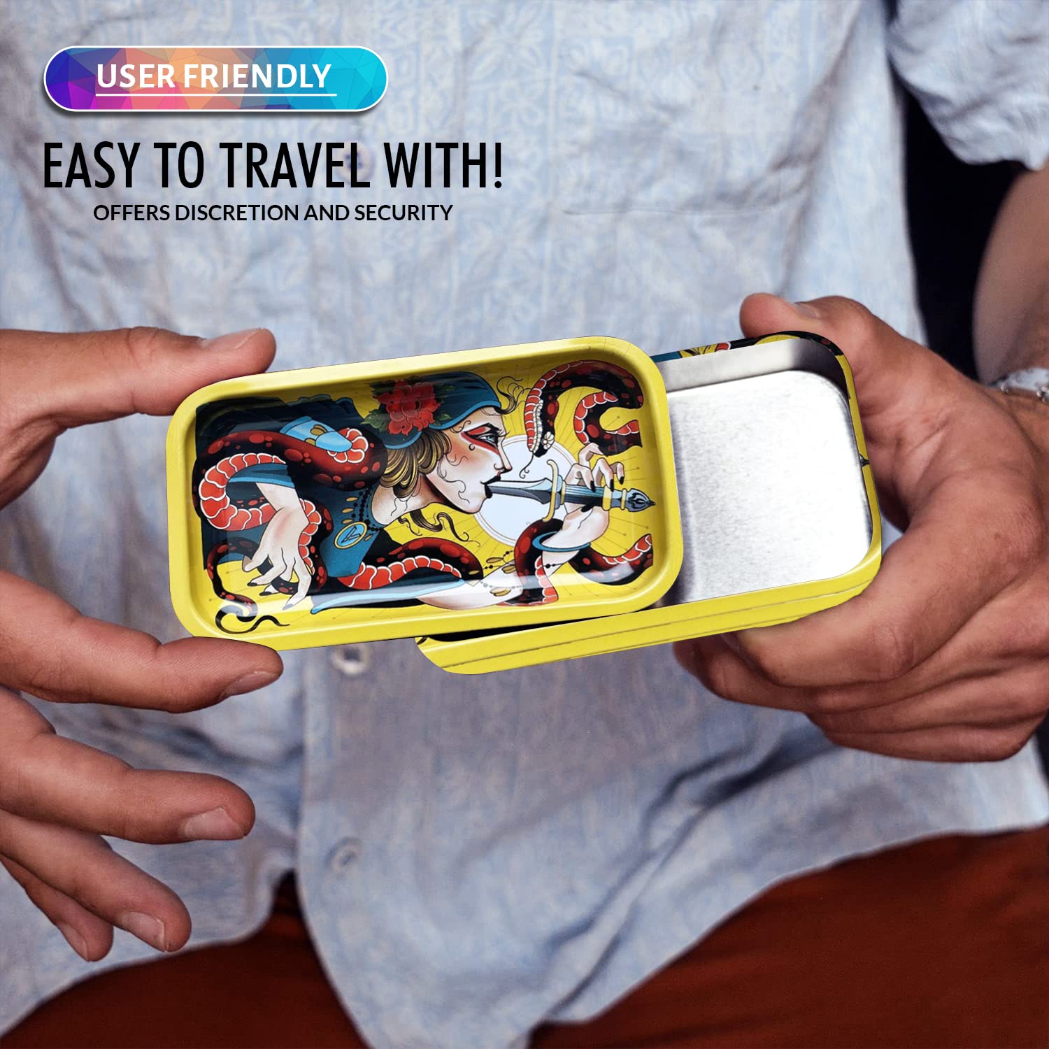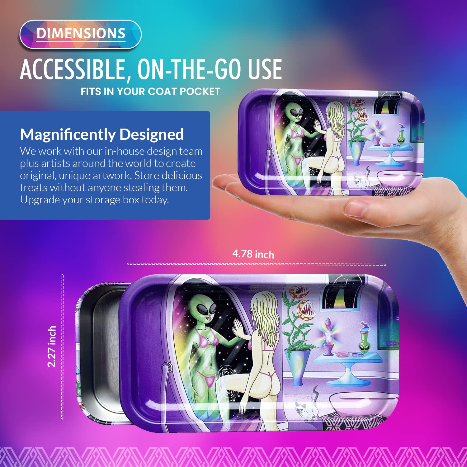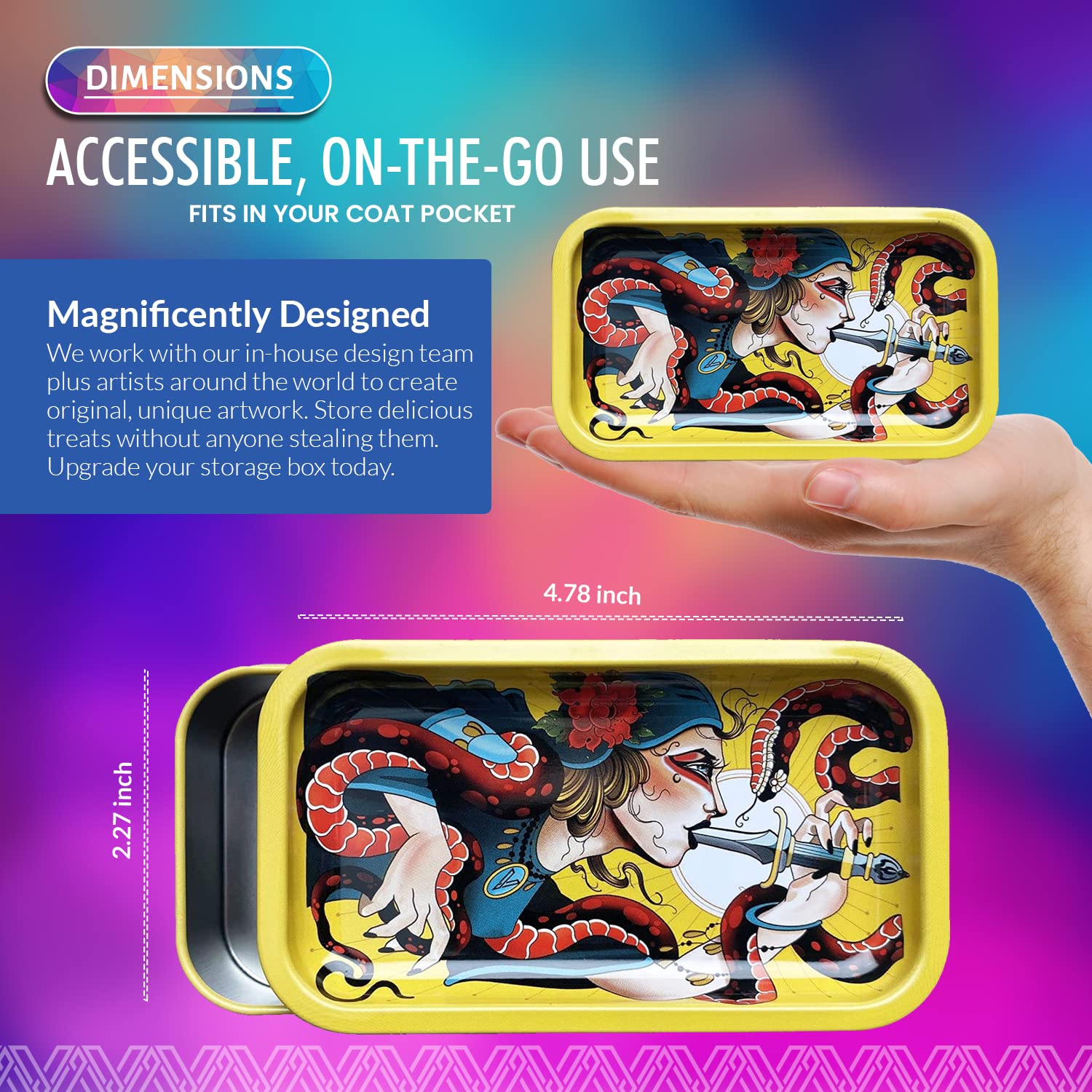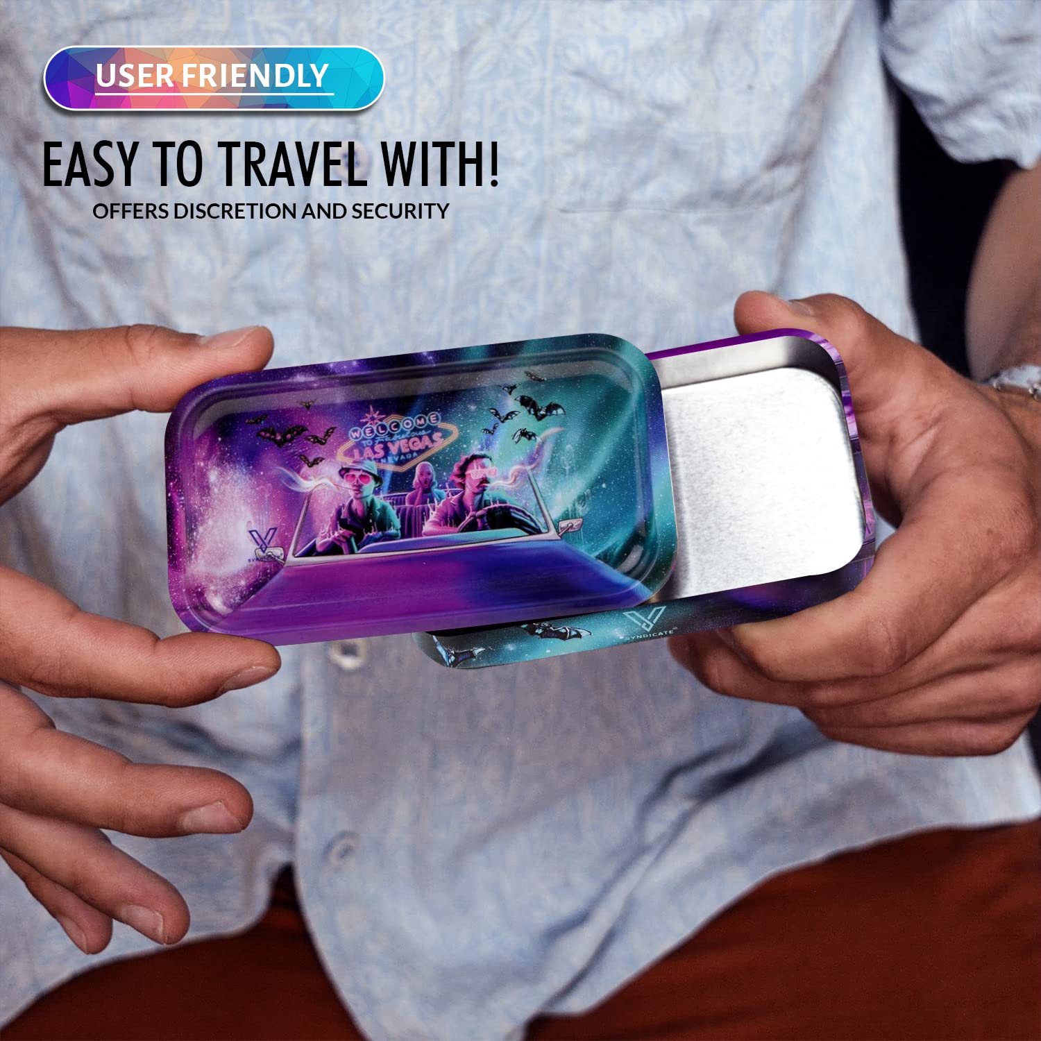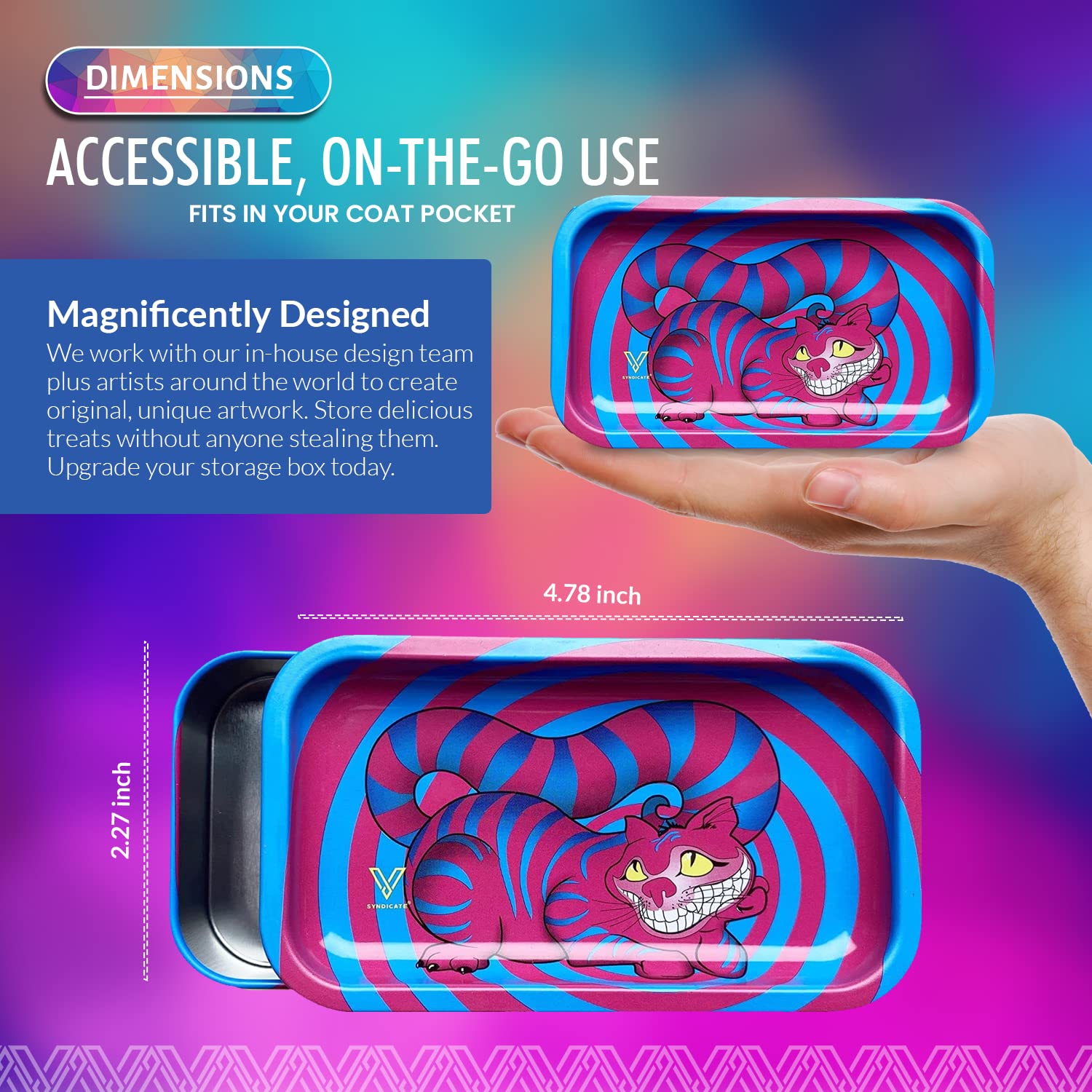 [Robust and Protected] The V Syndicate storage box is designed to provide robust and protected storage for your valuables. The premium metal construction and airtight seal ensure that your items are safe from moisture and other elements, ensuring their longevity for years to come. Don't settle for less, protect your valuables with the V Syndicate storage box. [Privacy and Freshness] Keep your treats fresh and hidden from prying eyes with the V Syndicate storage box. Equipped with an aroma-sealed airtight lid, this storage box guarantees to keep your treats fresh and hidden. Enjoy your treats in peace and privacy with our storage solution. [Personalized Style] Add a touch of personal style to your storage box with a unique 360 print of original artwork. Each piece is a one-of-a-kind creation that ensures that your storage box is not just a functional storage but also a stylish accessory. Stand out from the crowd with your unique storage solution. [Innovative 2-in-1 Design] Get the most out of your storage box with an innovative 2-in-1 lid design. Not only does it seal in freshness, but it doubles as a metal tray, making it the perfect companion for all your rolling needs.This travel-size box can even fit in a pocket. [Trusted Brand] Trust V Syndicate provides you with top-notch storage solutions that combine innovation, functionality, and quality. Our commitment to meeting customers' needs and providing the best quality products guarantees that your items will be safe and secure with our products. We are your go-to brand for storage solutions.