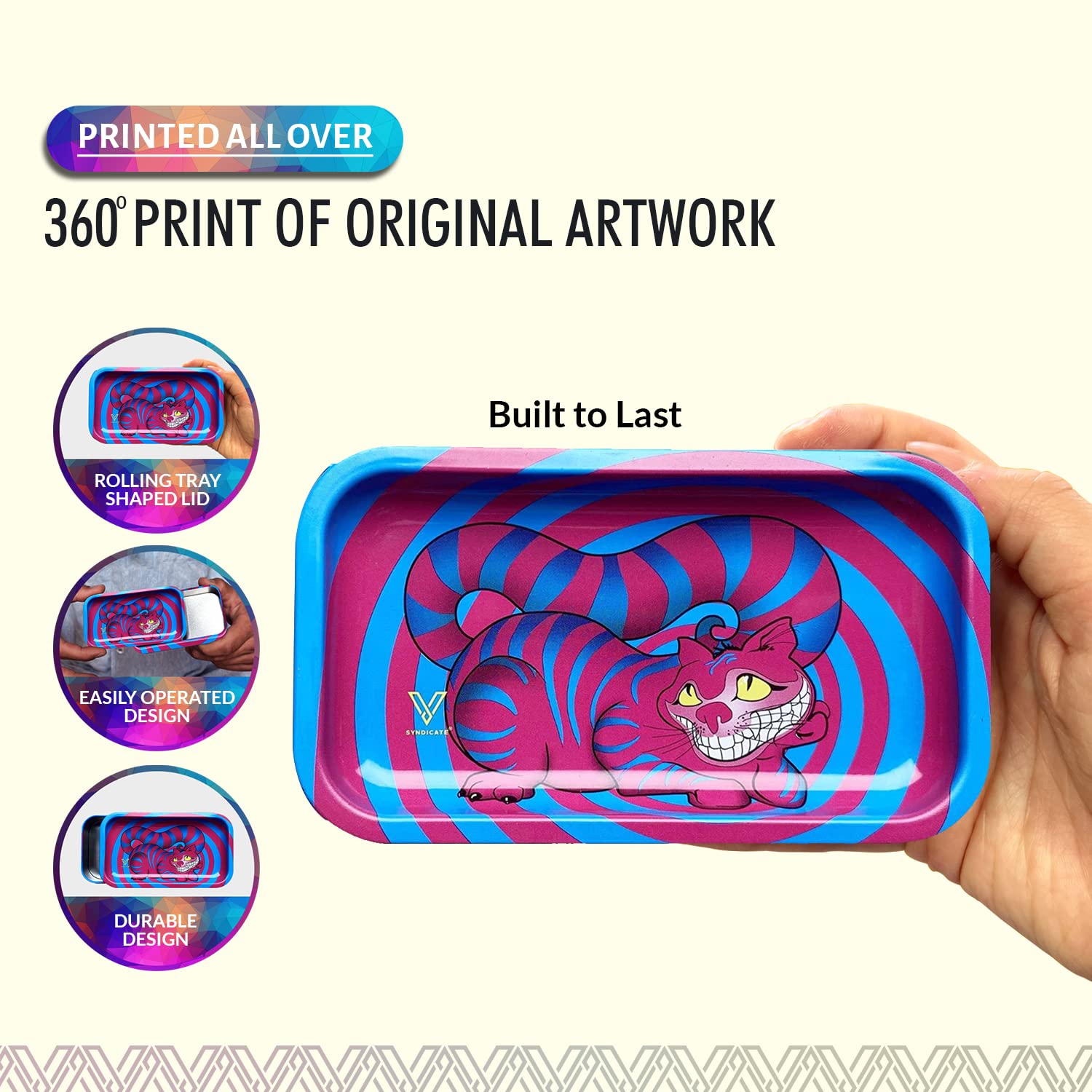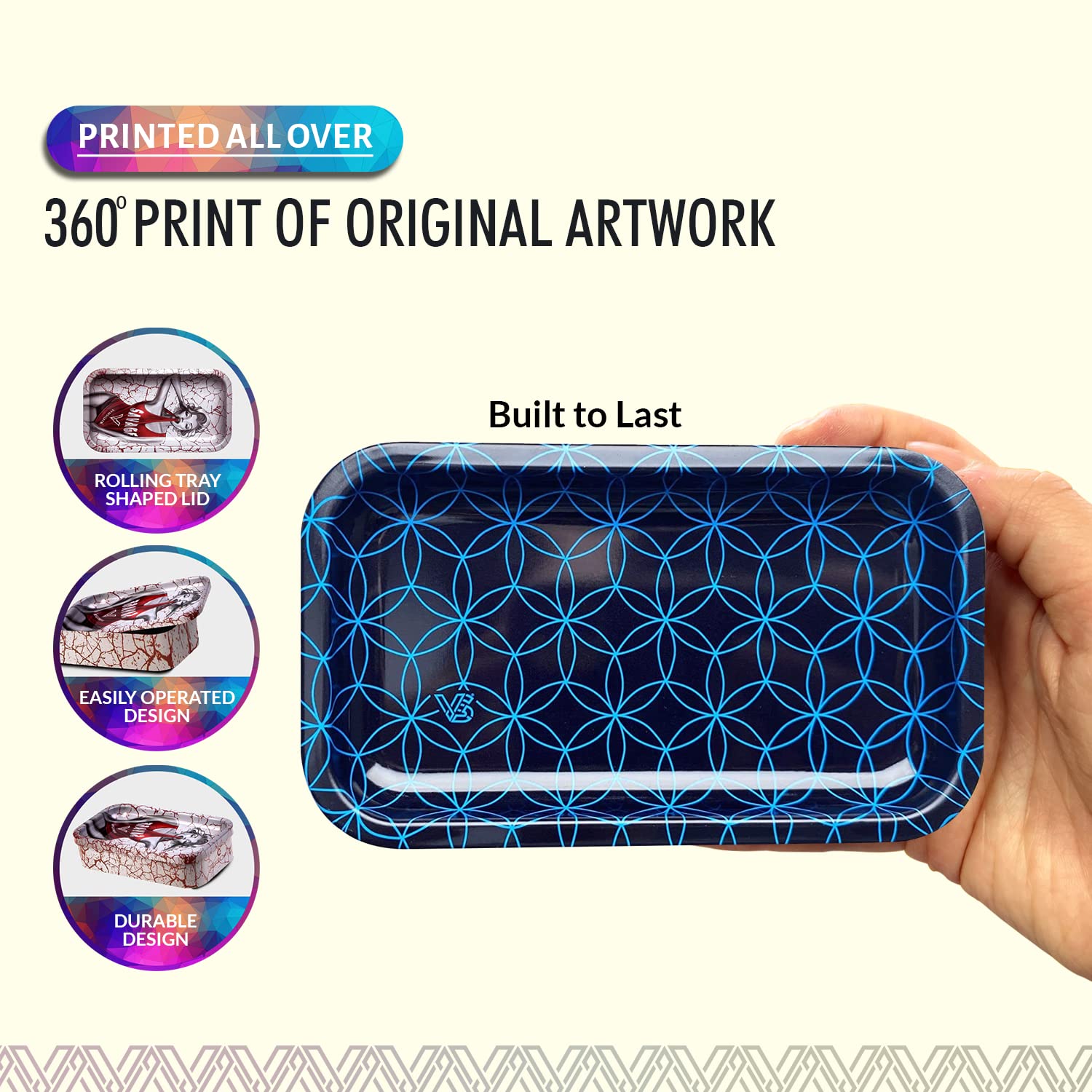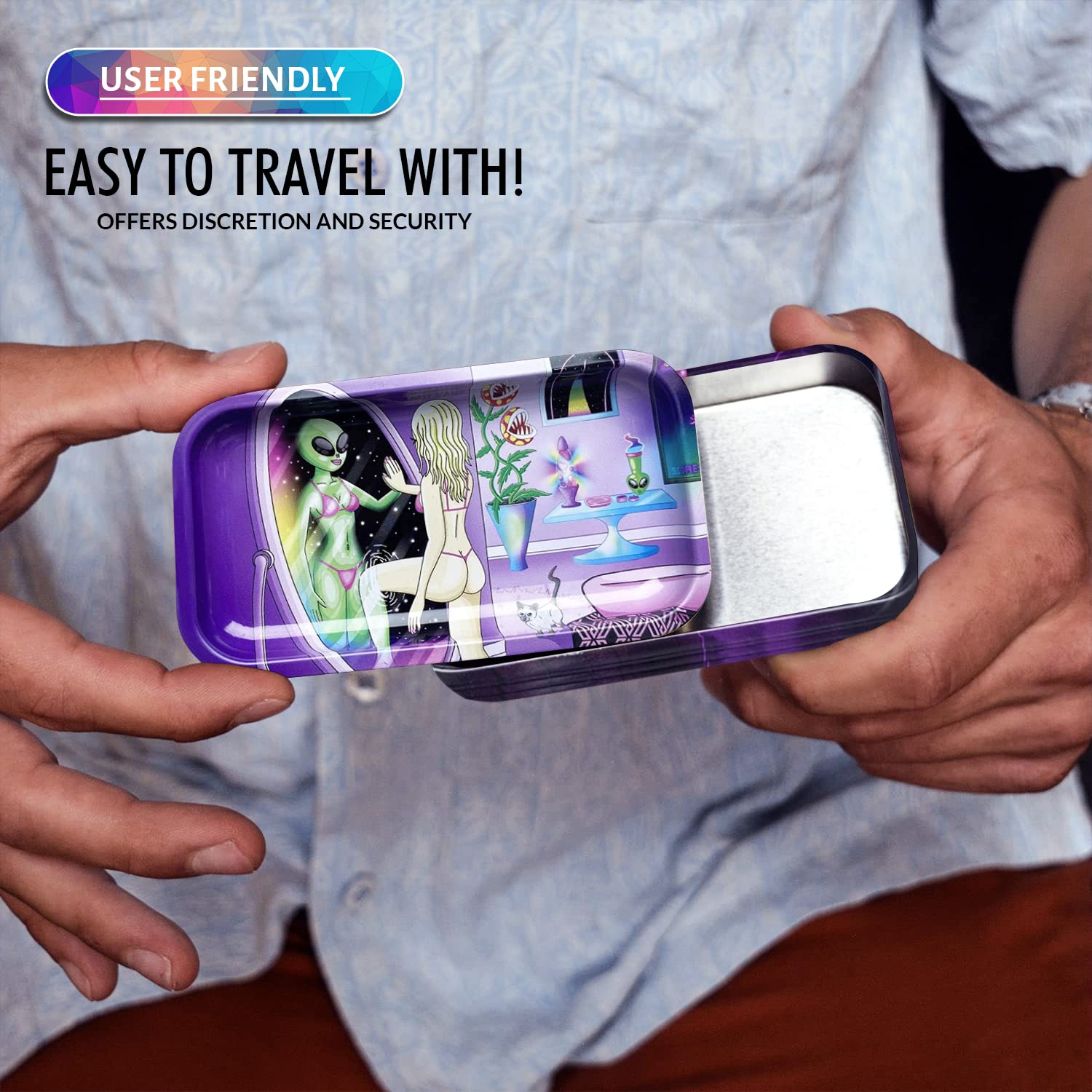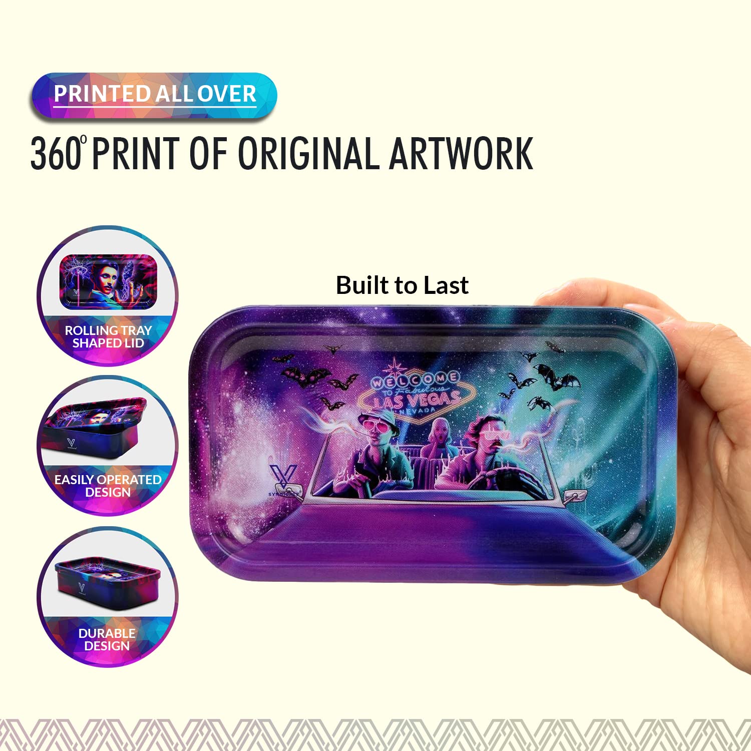 [Robust and Protected] The V Syndicate storage box is designed to provide robust and protected storage for your valuables. The premium metal construction and airtight seal ensure that your items are safe from moisture and other elements, ensuring their longevity for years to come. Don't settle for less, protect your valuables with the V Syndicate storage box. [Privacy and Freshness] Keep your treats fresh and hidden from prying eyes with the V Syndicate storage box. Equipped with an aroma-sealed airtight lid, this storage box guarantees to keep your treats fresh and hidden. Enjoy your treats in peace and privacy with our storage solution. [Personalized Style] Add a touch of personal style to your storage box with a unique 360 print of original artwork. Each piece is a one-of-a-kind creation that ensures that your storage box is not just a functional storage but also a stylish accessory. Stand out from the crowd with your unique storage solution. [Innovative 2-in-1 Design] Get the most out of your storage box with an innovative 2-in-1 lid design. Not only does it seal in freshness, but it doubles as a metal tray, making it the perfect companion for all your rolling needs.This travel-size box can even fit in a pocket. [Trusted Brand] Trust V Syndicate provides you with top-notch storage solutions that combine innovation, functionality, and quality. Our commitment to meeting customers' needs and providing the best quality products guarantees that your items will be safe and secure with our products. We are your go-to brand for storage solutions.
