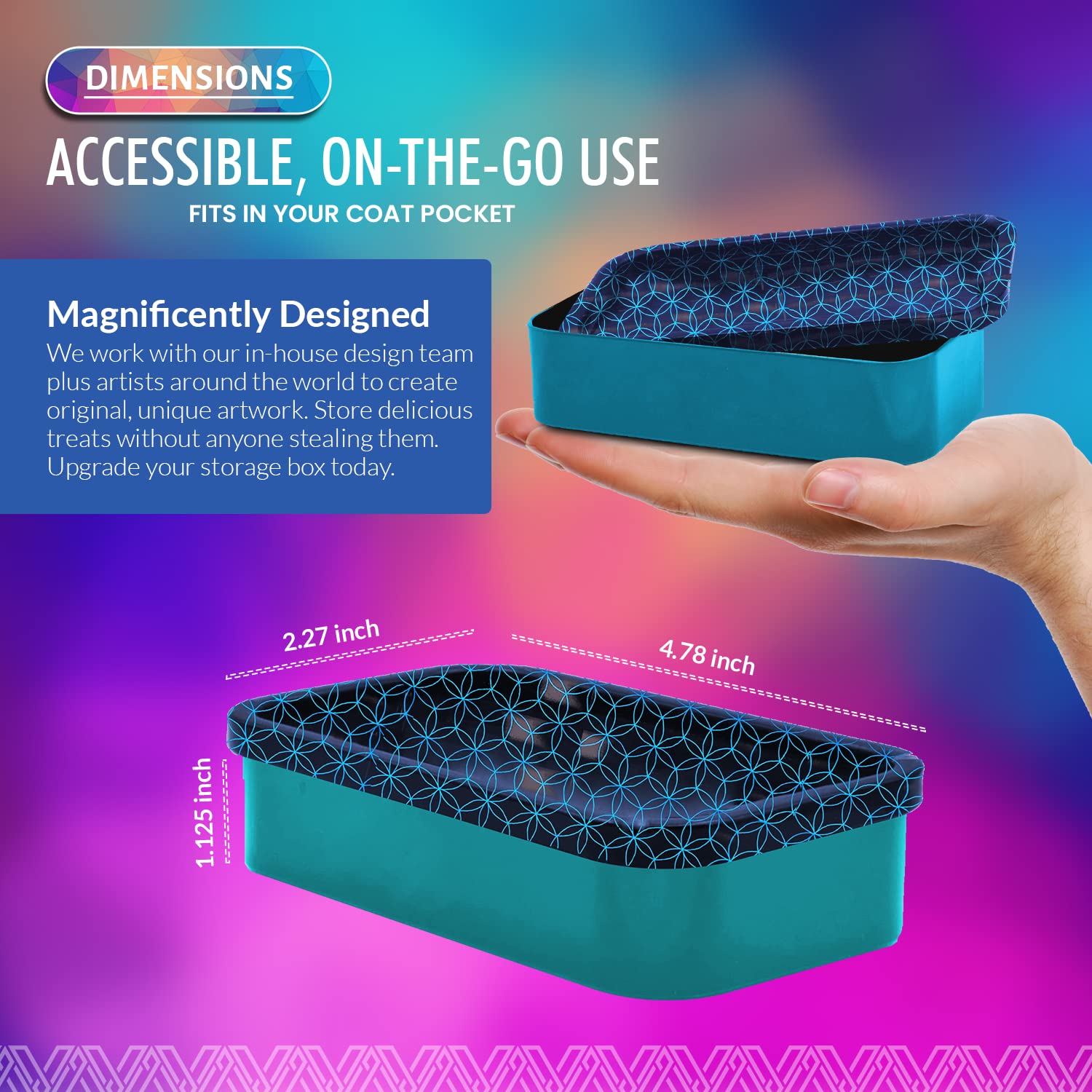 - 2-in-1 Tray Lid - Get the most out of your storage box with innovative 2-in-1 lid design. Not only does it seal in freshness, but it doubles as a metal tray, making it the perfect companion for all your needs. Upgrade your storage game with 2-in-1 Tray Lid. This travel size box can even fit in a pocket.