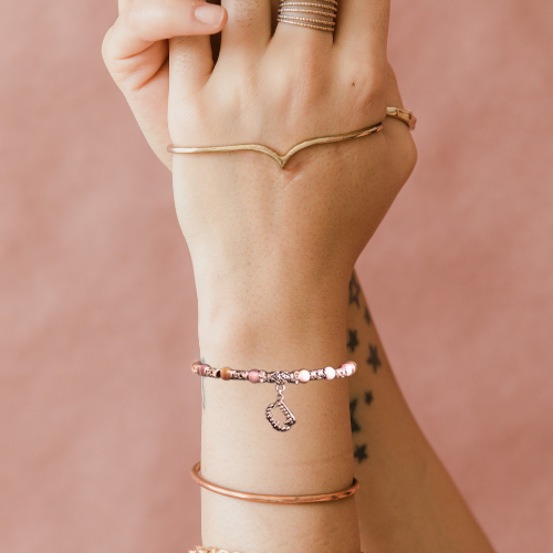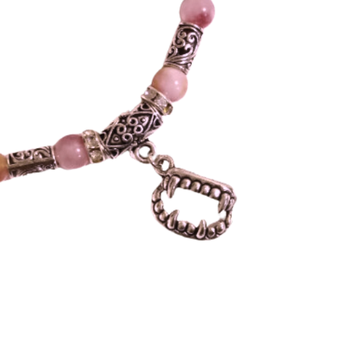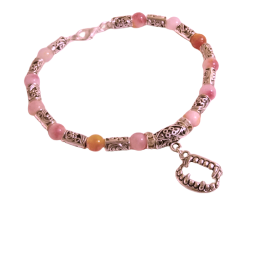Newly released by ShopAtLuxe, this stunning bracelet gives a nod to the designer's fun side. This piece an editorial look to it's art. Handcrafted to order, this gender free expressive piece features a silver tone, detailed, vampire teeth charm, which is lead and nickel free, suspended from an embellished silver bail, between two crystal spacers, which is nestled among 4mm embellished silver tube beads that alternate between red swirl round stones. Measures 7.5, with stretch cord. Medium weight; casual fit. If you're in need of a different size, please send us a chat through Mercari. We are happy to accommodate your request. Perfect gift for any gender. Complimentary gift with purchase!