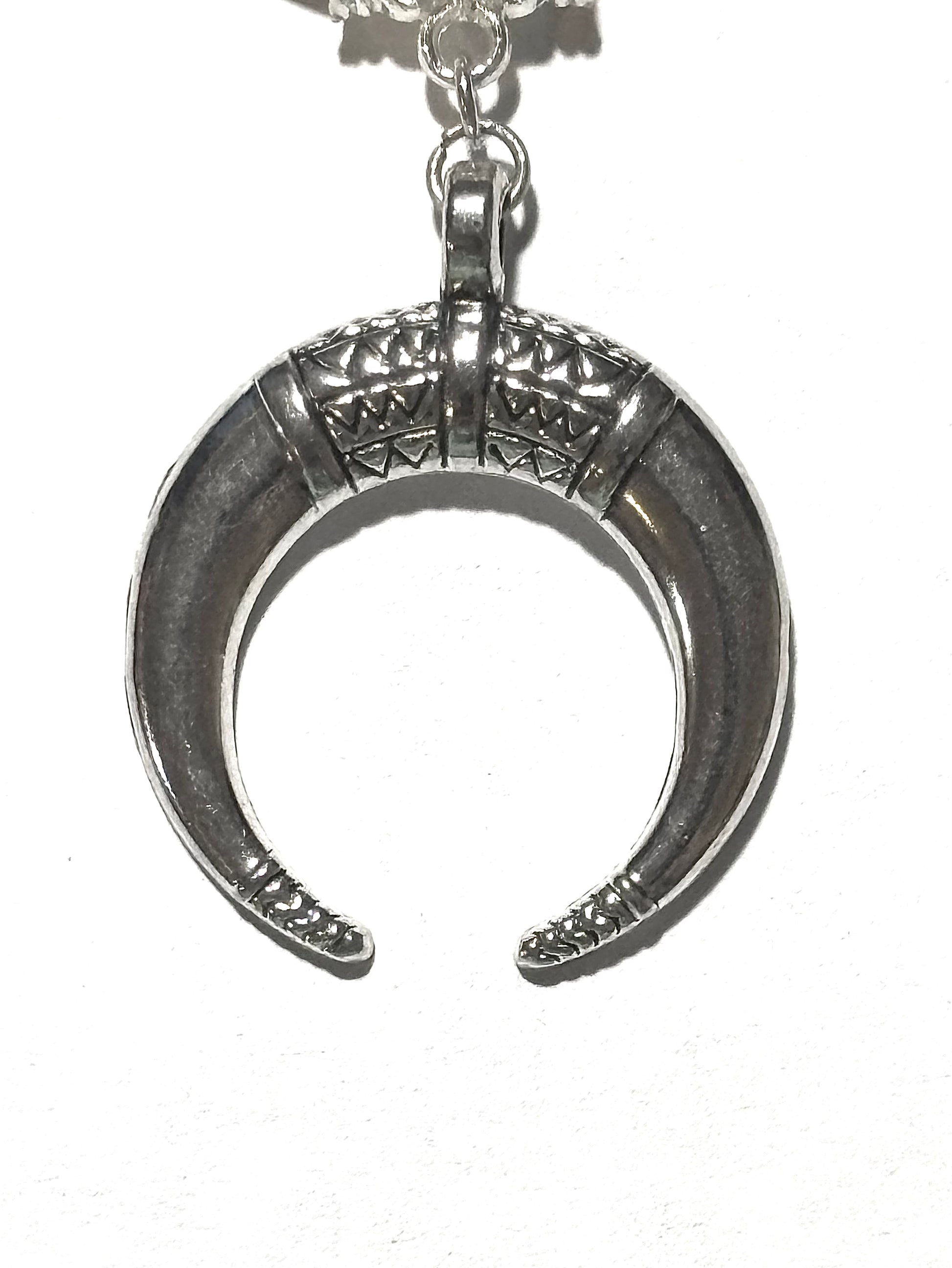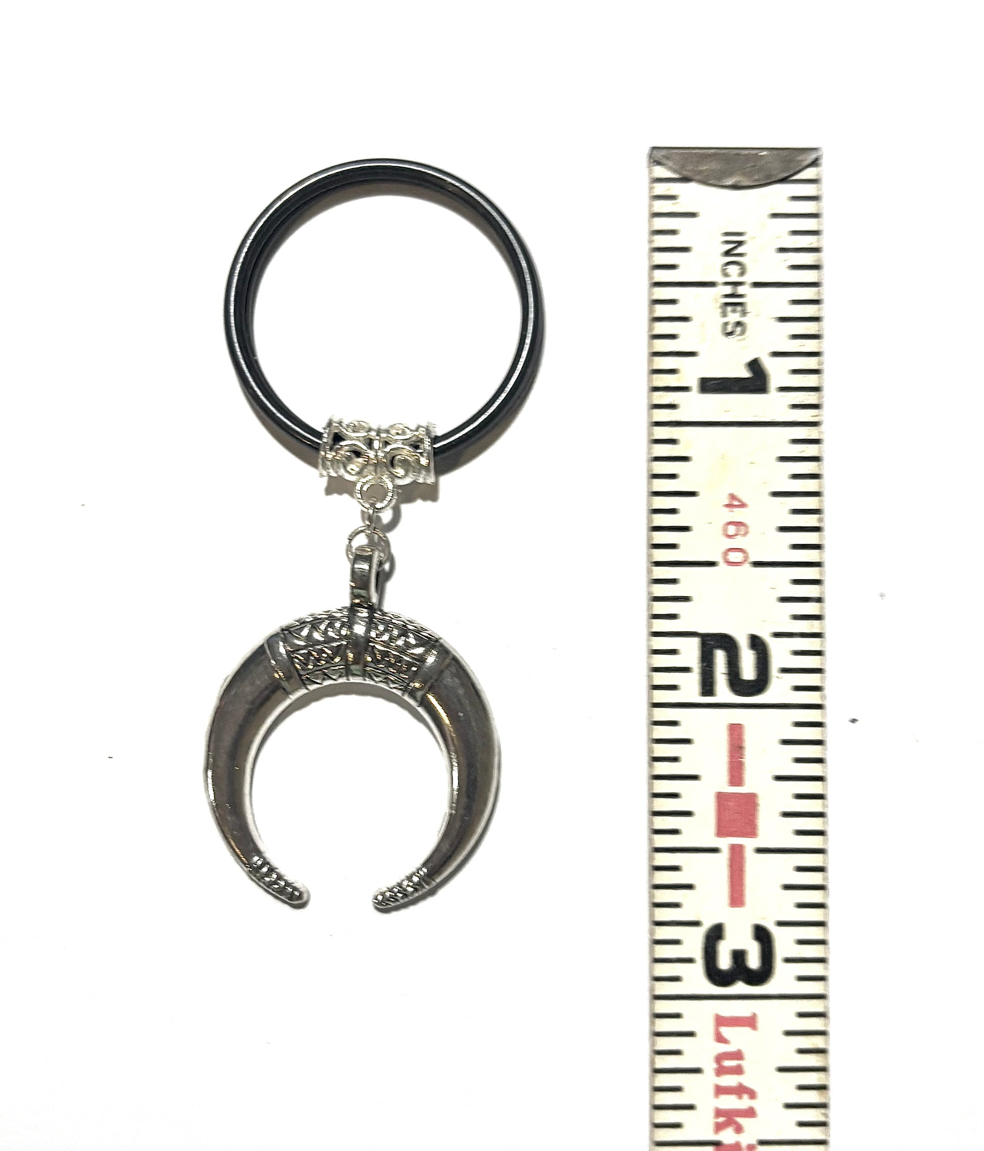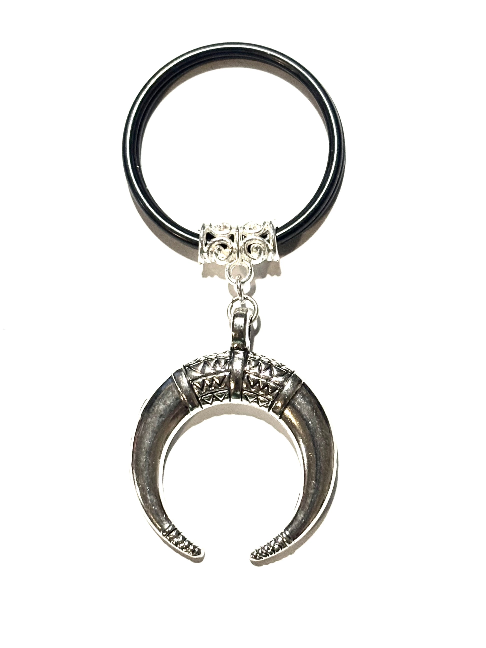 From our Global Tour Collection, this stainless steel Horn of Odin, or Crescent Moon pendant, is suspended from a high shine silver bail and black keyring. The horn moon charm measures 1.18 wide x 1.18 length in inches. Lead and nickel free. Hypoallergenic. Complimentary gift with purchase.