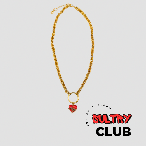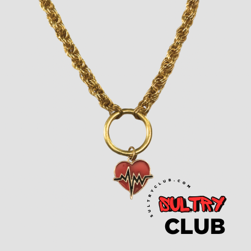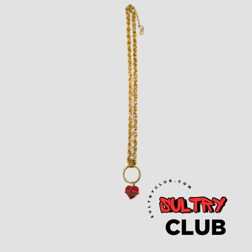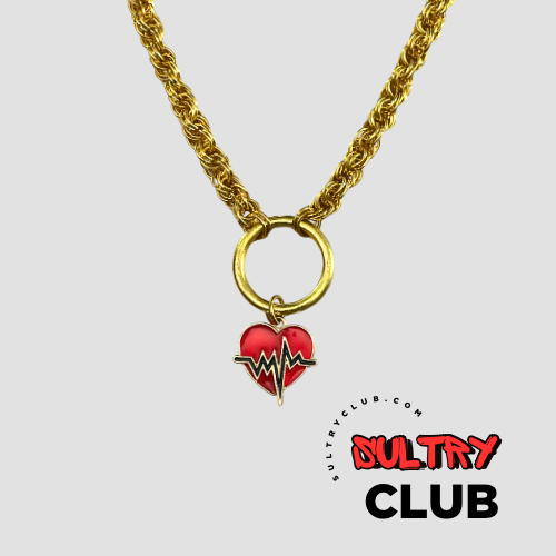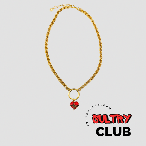 Handcrafted from high quality materials, this necklace displays an .85 inch red heart with a pulse, suspended from a 12 gauge solid gold electroplated o ring. Both pendants are suspended and held captive by two equal strands of hand woven chain. The choker measures a generous 20 inches with 2.5 inch extender chain with a pave crystal heart embellishment bead. Lead and nickel free. Complimentary gift with purchase.