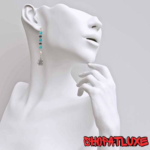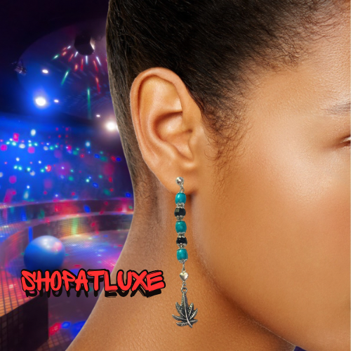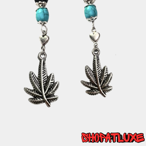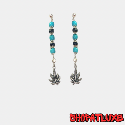Weed Leaf charms suspended from crystal and Turquoise beaded dangles.  With silver ball posts.