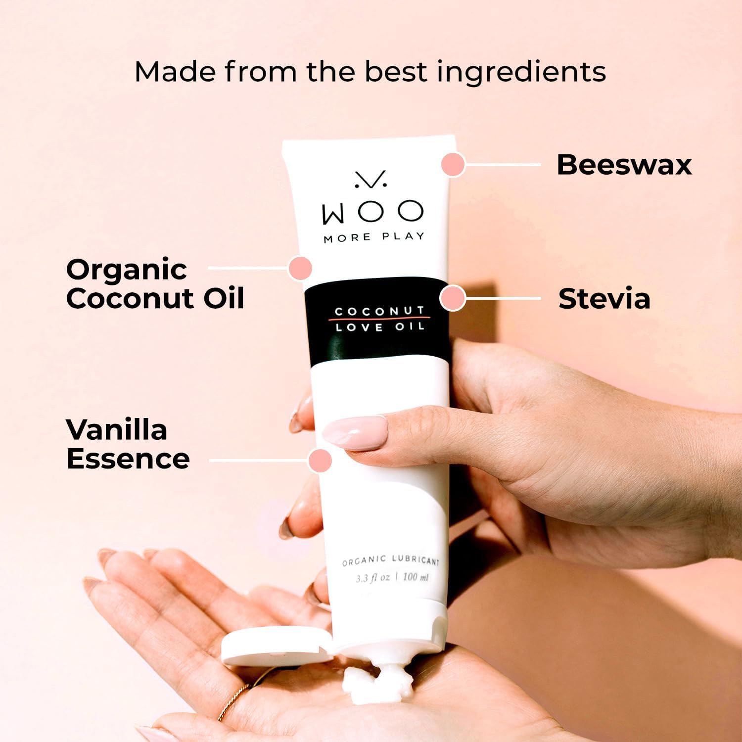 - Indulge in the ultimate experience with Woo More Play Coconut Love Oil – a natural and organic lubricant crafted for comfort. Backed by rave reviews from experts, this lube is formulated with ingredients so pure, you could practically eat them.