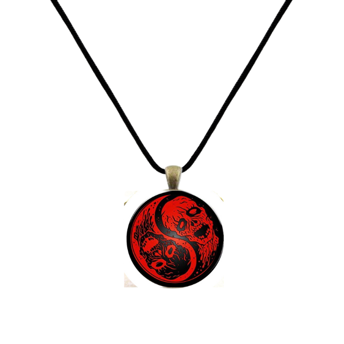 Newly handcrafted, this eye catching necklace is constructed of high quality pieces. Feathers a black/red vivid graphic cabochon pendant, suspended from a 22 inch chain of your choice. (Antique Bronze, Black Leather, Silver or Black Chain.) If in need of a different length, or you'd rather have leather or a black cable link necklace, please notify us through messaging. Lead and nickel free; hypoallergenic. Pendant measures 1 inch. Complimentary gift with purchase.